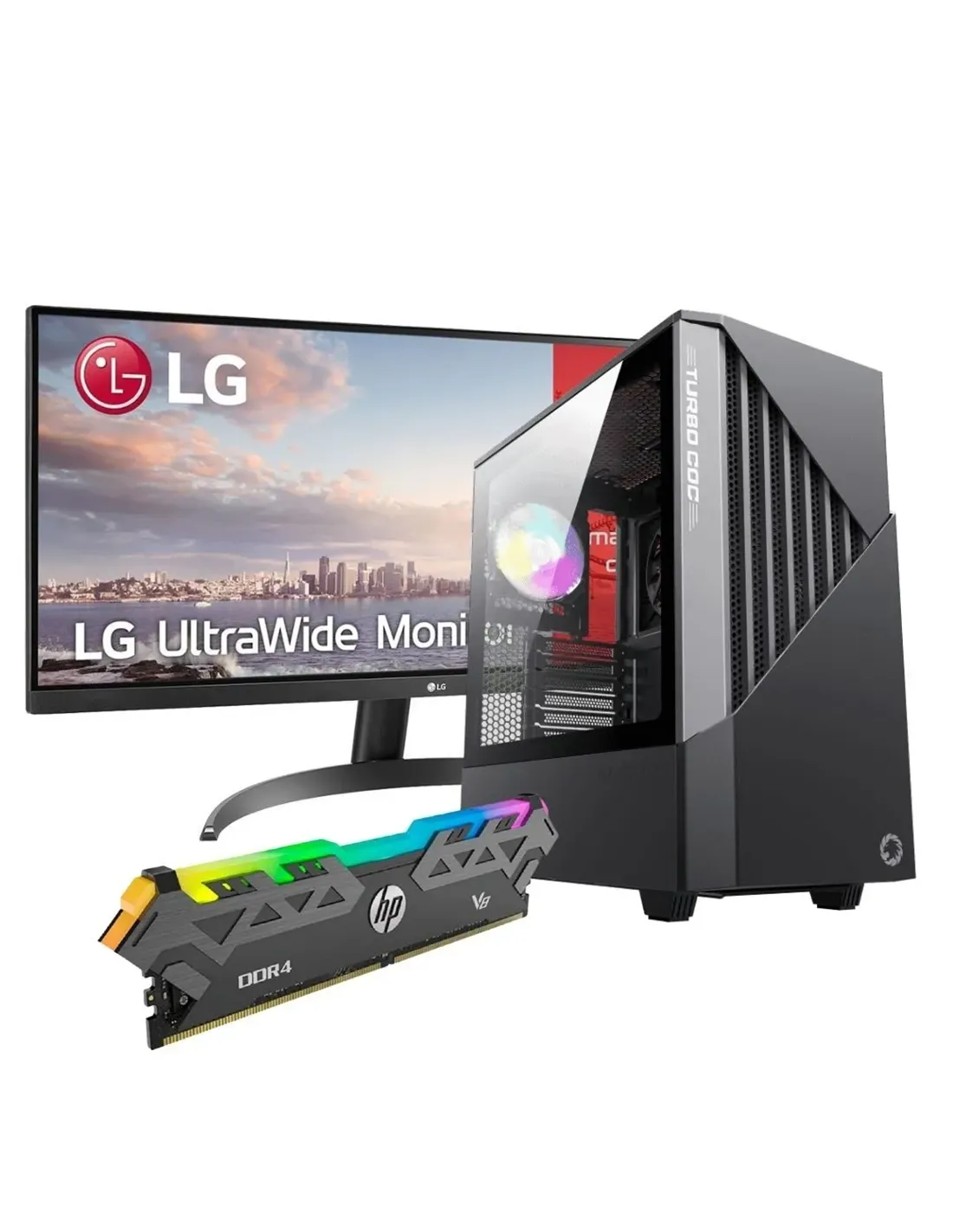 Computador AMD Ryzen 5, Monitor LG 29wp500-b 29", Chasis Gamemax Contac COC BG, Memoria RAM DDR4 HP V8 8GB RGB