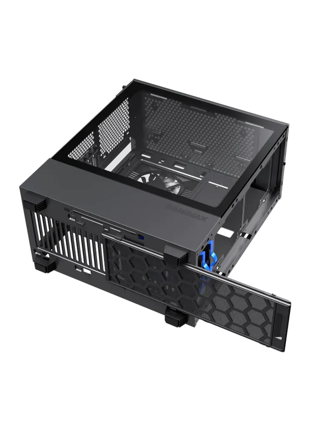 GameMax Contac Turbo MID-TOWER cuenta con una ventana lateral de vidrio de fácil apertura con tornillos de una sola pieza y junto con un ventilador ARGB de 14 cm en la parte delantera y un ventilador de 12 cm en la parte trasera, puede controlar sin esfuerzo la iluminación y los ventiladores ARGB a través de GameMax V2.0 PWM + Controlador Rainbow HUB preinstalado, mientras que la reducción de ruido adaptativa se optimiza mediante controles PWM.