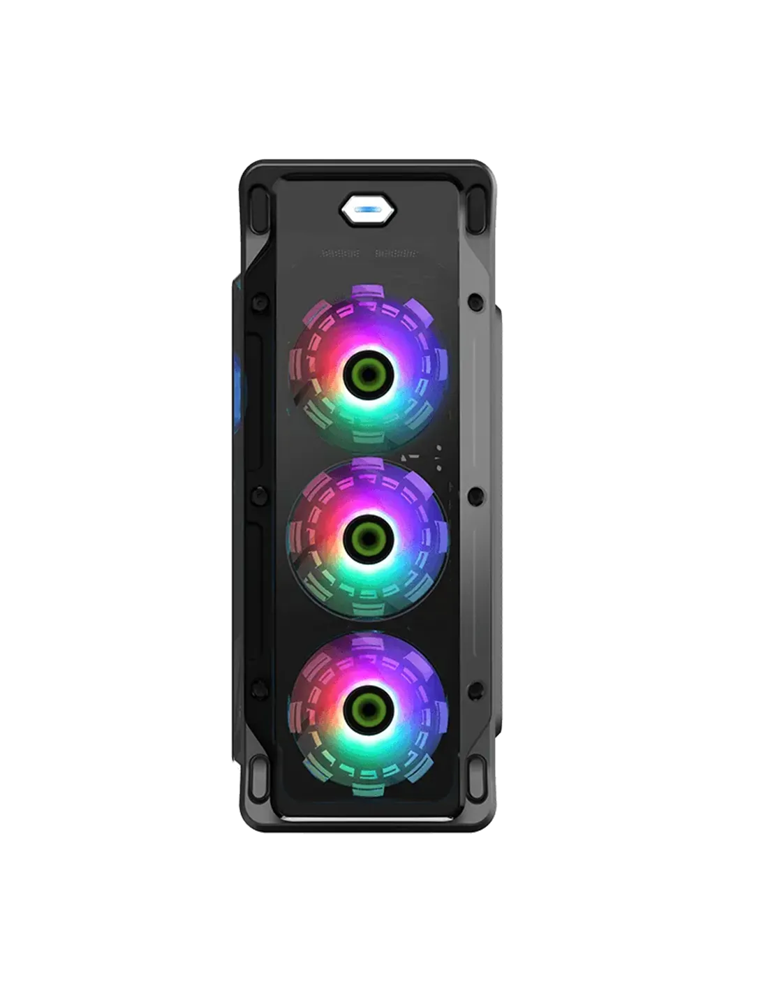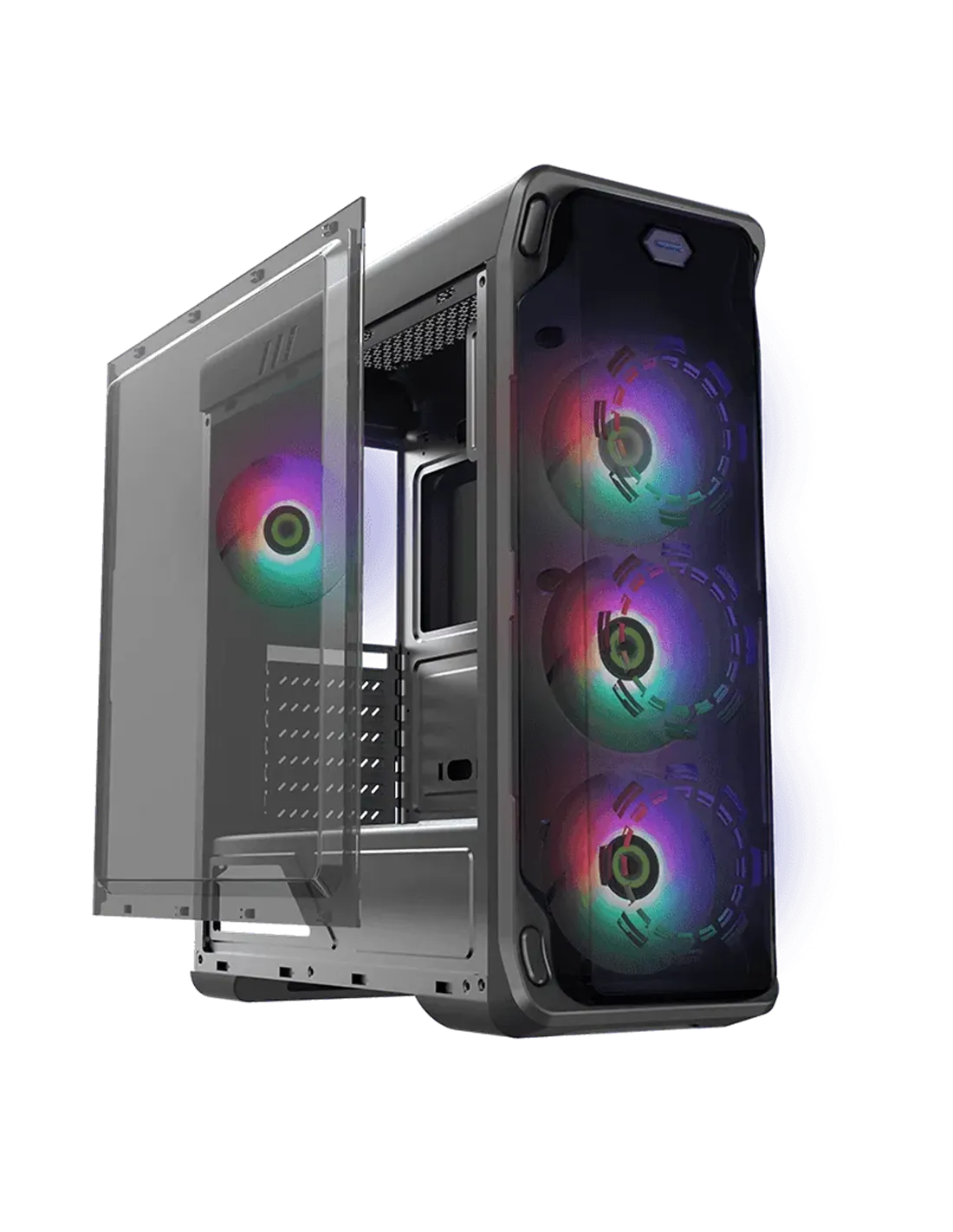 Los 4 ventiladores delanteros y traseros fijos RGB de 12 cm en total le dan a la carcasa un estilo único, a la vez que mantienen el sistema fresco. También el frente puede soportar un radiador de 240 mm.