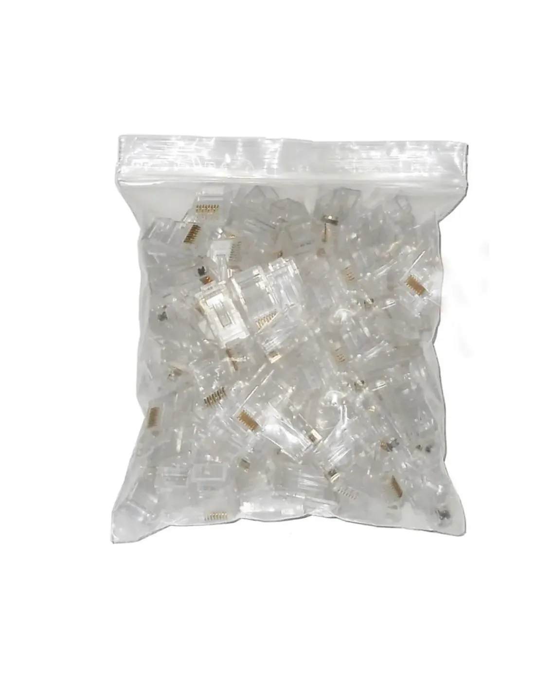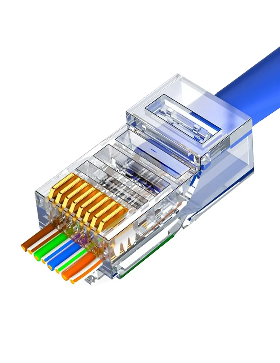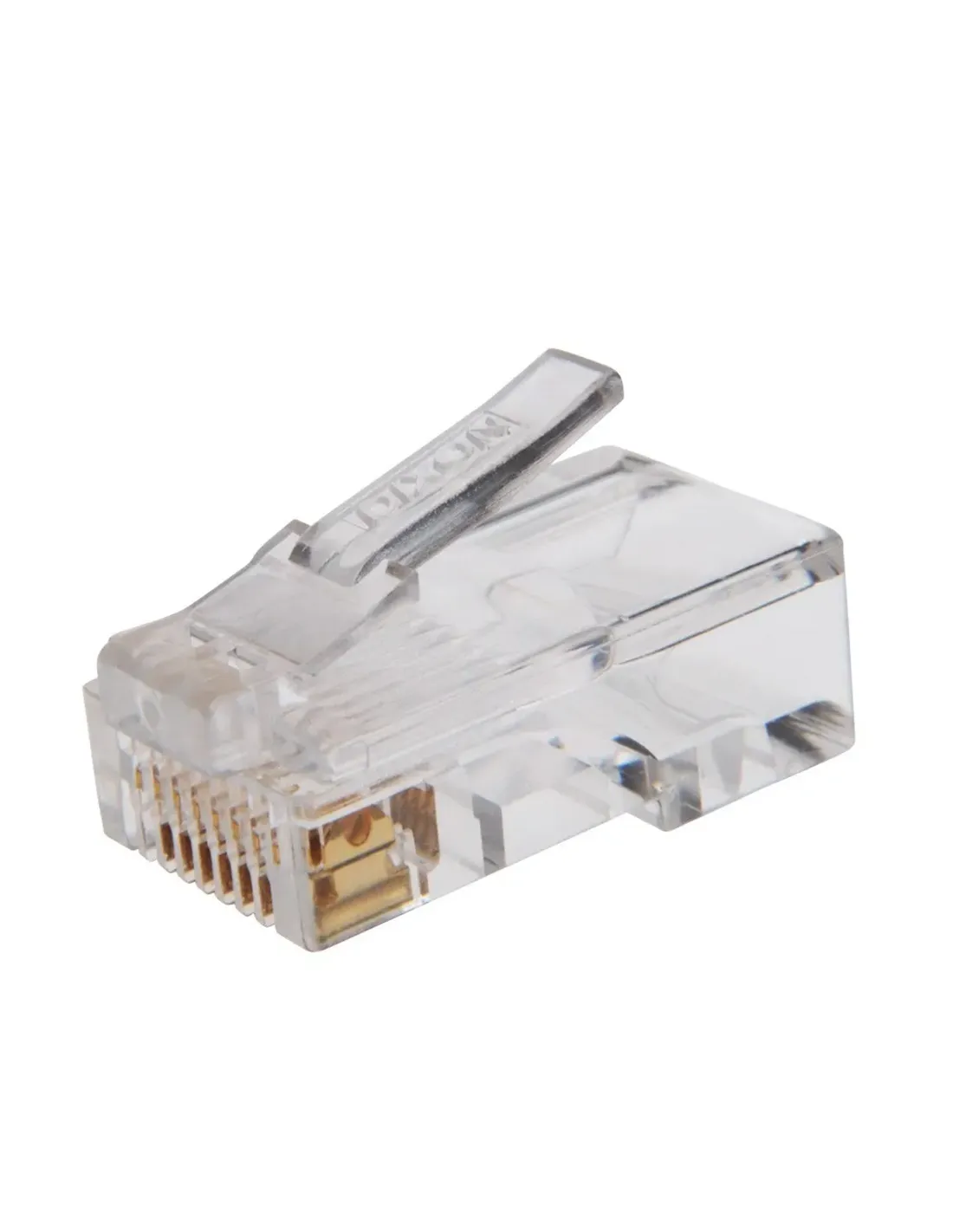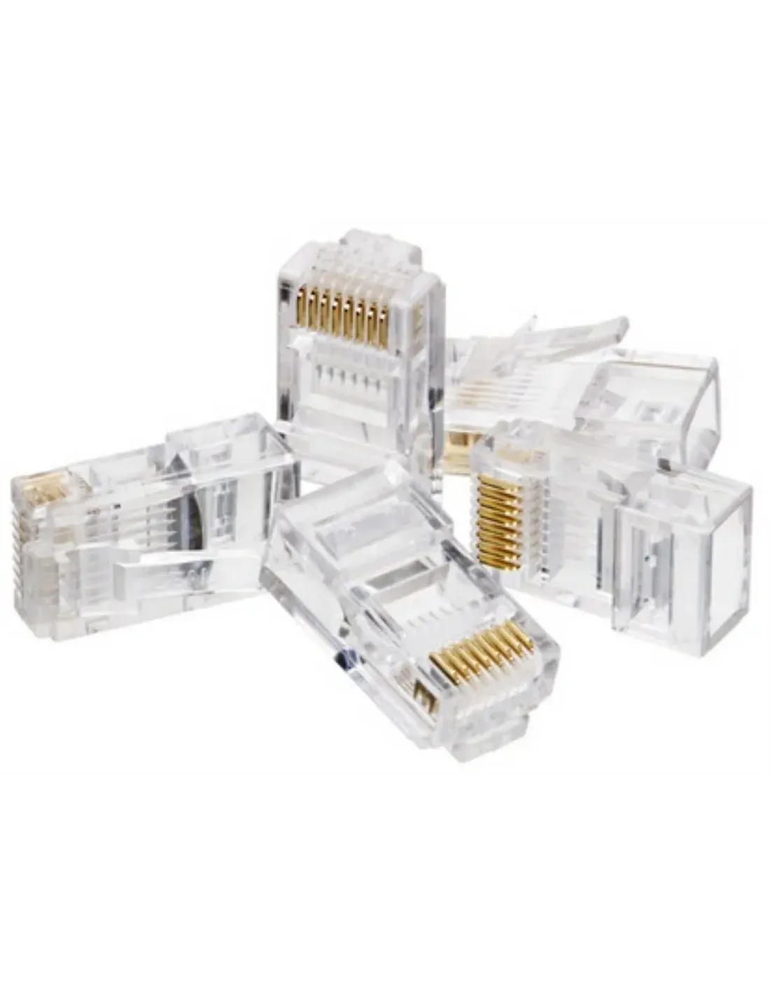 Conector macho (plug) de 8 contactos (RJ45) para cable redondo en Categoría 6, con baño de oro de 50 micras para transmisión de datos hasta 1 Gbps, para armar cables Ethernet y realizar instalaciones de redes de computadoras.